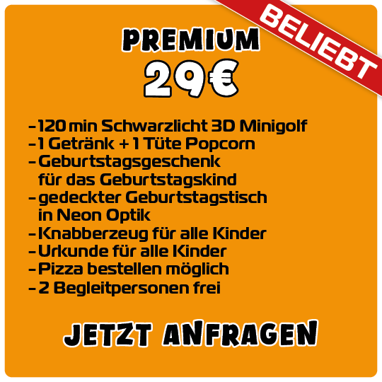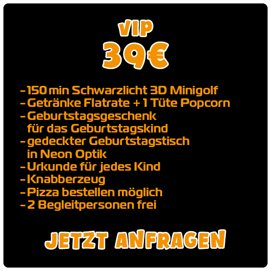 Selbstverständlich könnt ihr eine Geburtstagsparty in unserer Schwarzlicht-Minigolf-Anlage organisieren und gemeinsam ein spannendes, kurzweiliges und unvergessliches Erlebnis genießen!
